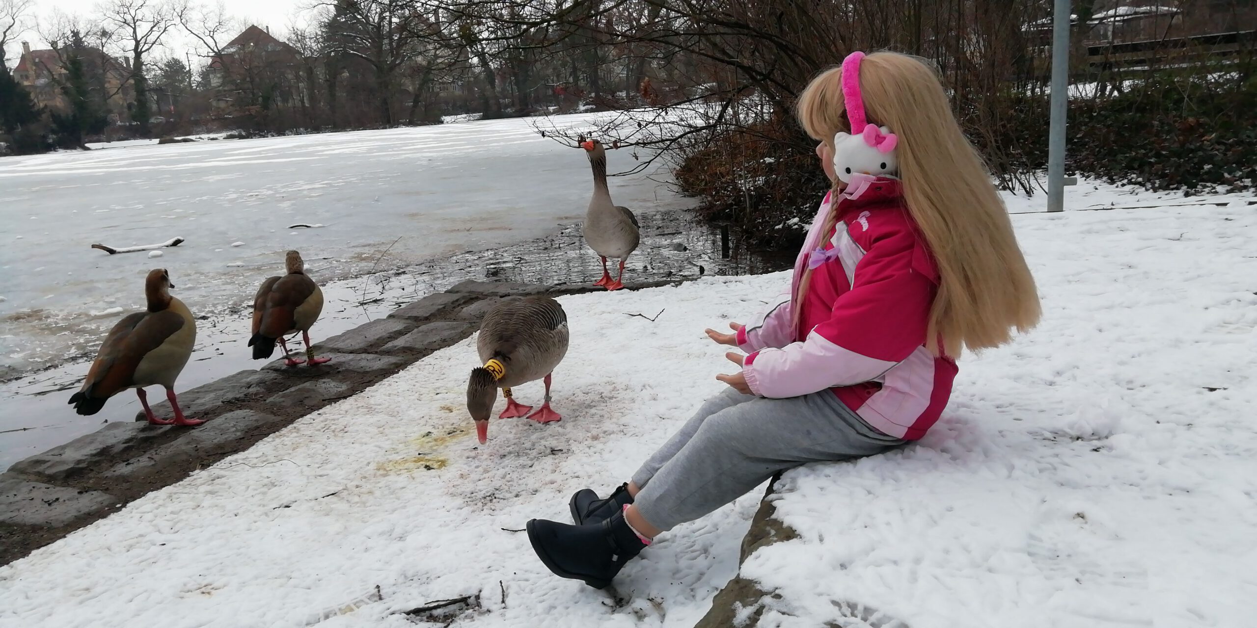 Die Winterzeit hält noch an, der Schnee kommt und geht und die Temperaturen schwanken! Desiree war trotzdem im großen garten unterwegs um die Enten und Gänse zu füttern! An diesem Tag lag noch genug Schnee um einen großen Schneemann bauen! Das hat ihr großen Spaß gemacht!